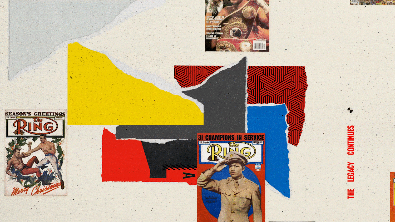 The Ring Magazine returns to the spotlight with a rebranding that celebrates the magazine's 102-year history. To tell a bit of this story, we explored a collection of 1,230 issues, over 10,000 fights, 5,000 knockouts, and, most importantly, a lot of craft, blending digital techniques such as illustration, animation, and collages, further expanding the brand's visual system.
